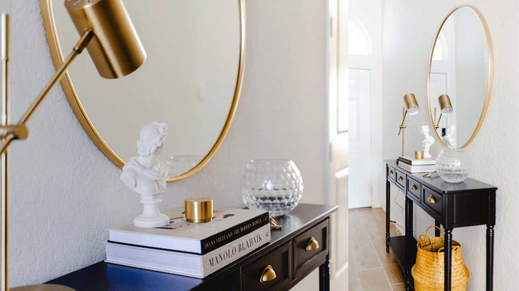 I have always loved the idea of the entry table and I knew I wanted one for multiple reasons. To start, it is the first place that welcomes guests into my home. Additionally, I wanted the space to reflect me, my life, my interests, and give a glimpse of what’s to come throughout the rest of the home.