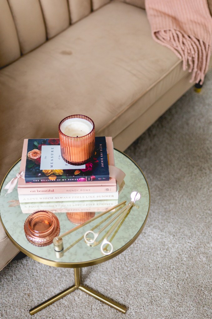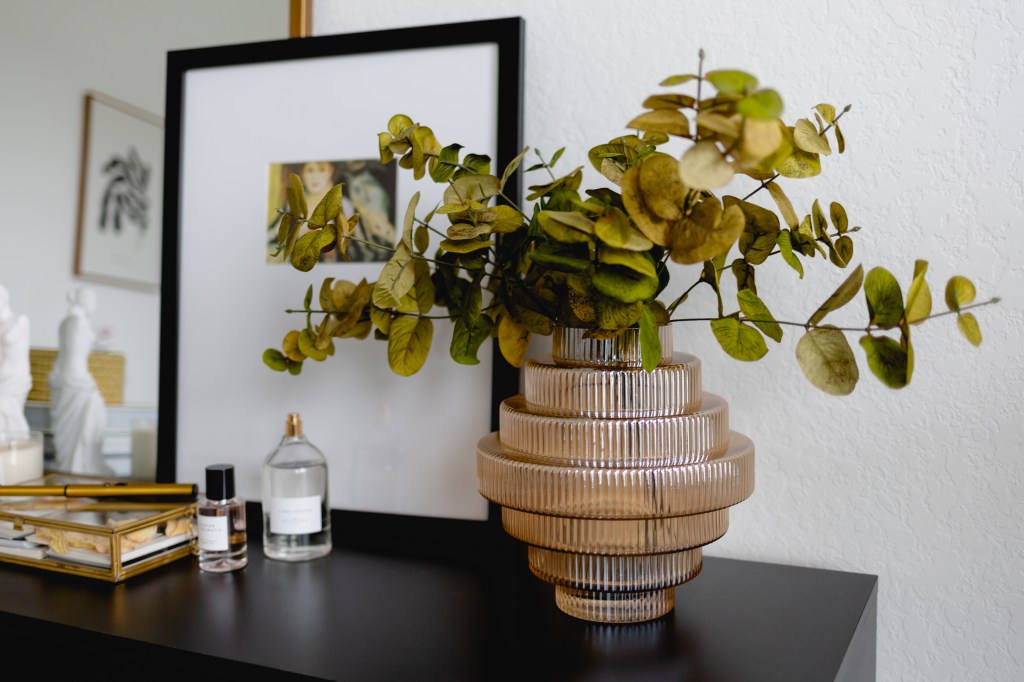 I found and ordered this interesting amber toned, art deco inspired vase from Amazon. I immediately then ran to hobby lobby and grabbed a faux greenery bundle to add to the vase. By golly, I think this might work! I took some time and played around with the placement, played with the layers, and then with the negative space. It finally felt right. I even love all the simple details all the way down to the electric lighter, which is totally cool and oldly fun to use.