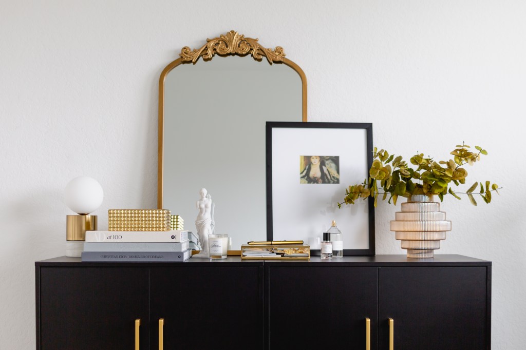 Upon assembly of the credenza, by yours truly, I grabbed several items I had at the ready, and I then began to zhuzh the space. I liked the layout ok, but, it felt a little cold and a bit lifeless – not the vibe I was going for. But this is typical and all part of the decorating process.