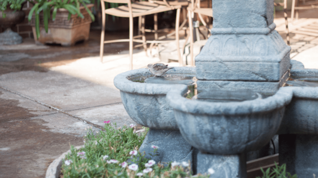 The patio is speckled with wrought iron patio tables & chairs, along with green umbrellas to match the ‘green’ theme, it being nestled inside the town of Gruene and all. Situated in the center of the courtyard is a water fountain feature that was recently, and regrettably, turned into a flower bed. That being said, imagine the last nine years with this lovey fountain spouting water from the top and overflowing below into its reserved basins. Upon which birds would come, drink, bathe, and play, much to the delight of every onlooker and patron in attendance.